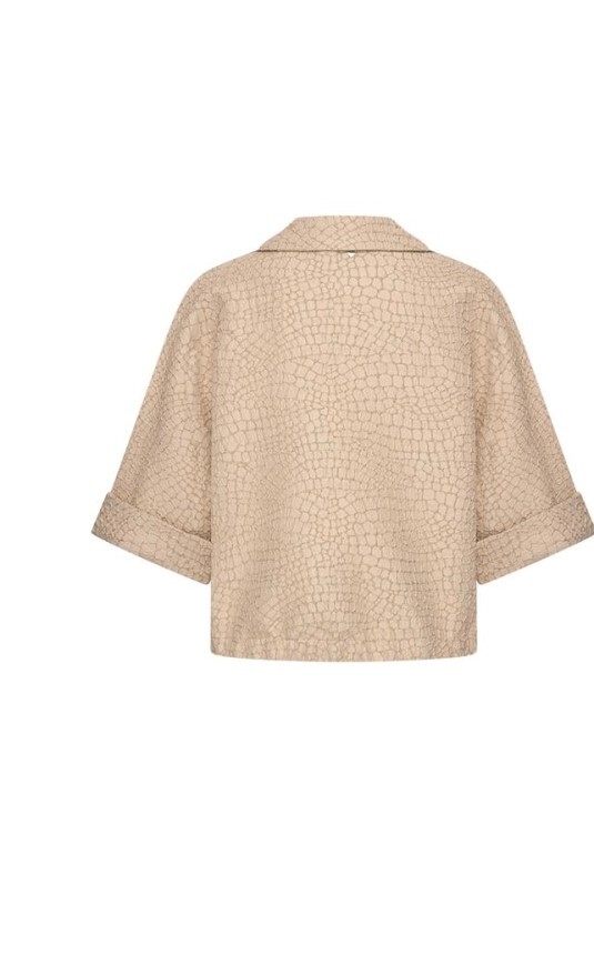 BLAZER PIEN CROCO 7733 SAND VAN HELENA HART in een prachtige zandkleur,uitgevoerd in een jacquardstof met een verfijnd reliëfpatroon. De subtiele glansdraad in het dessin geeft het jasje een chique en exclusieve uitstraling.het model is voorzien van een klassieke reverskraag, een enkele knoopsluiting en een mooie gestructureerde pasvorm. Deze blazer is een must-have voor elke modebewuste vrouw die haar garderobe wil verrijken met een veelzijdig en elegant item.