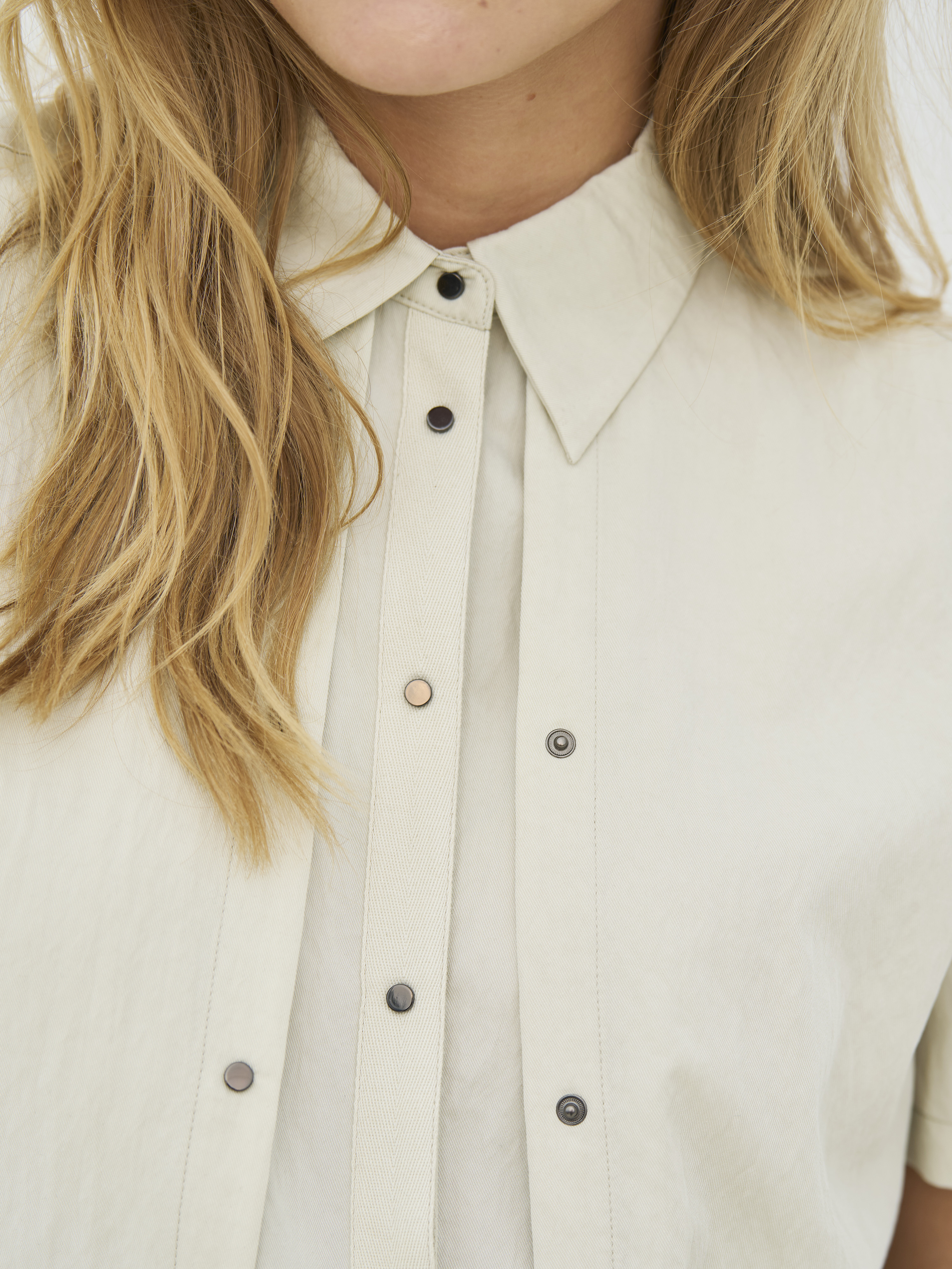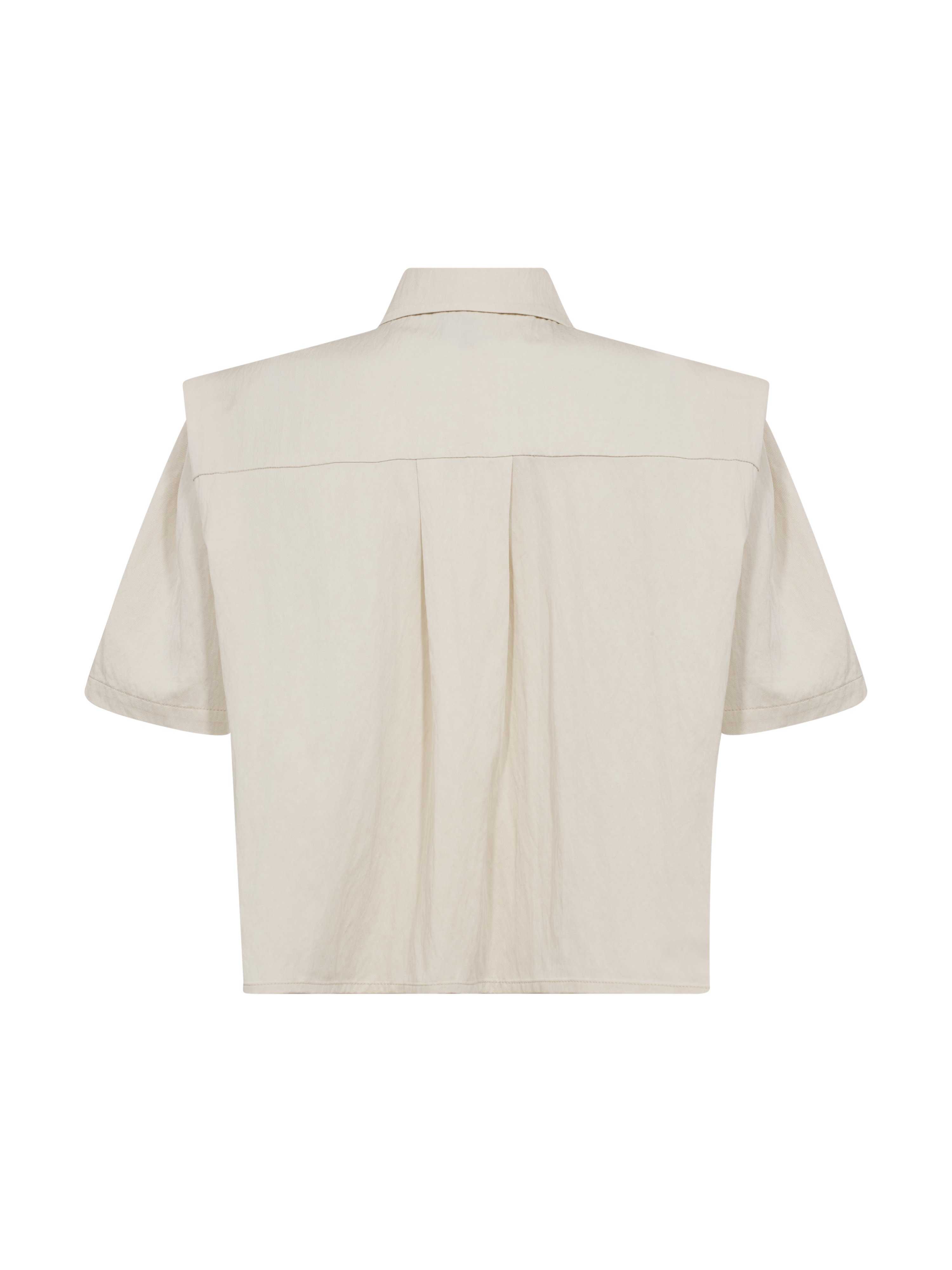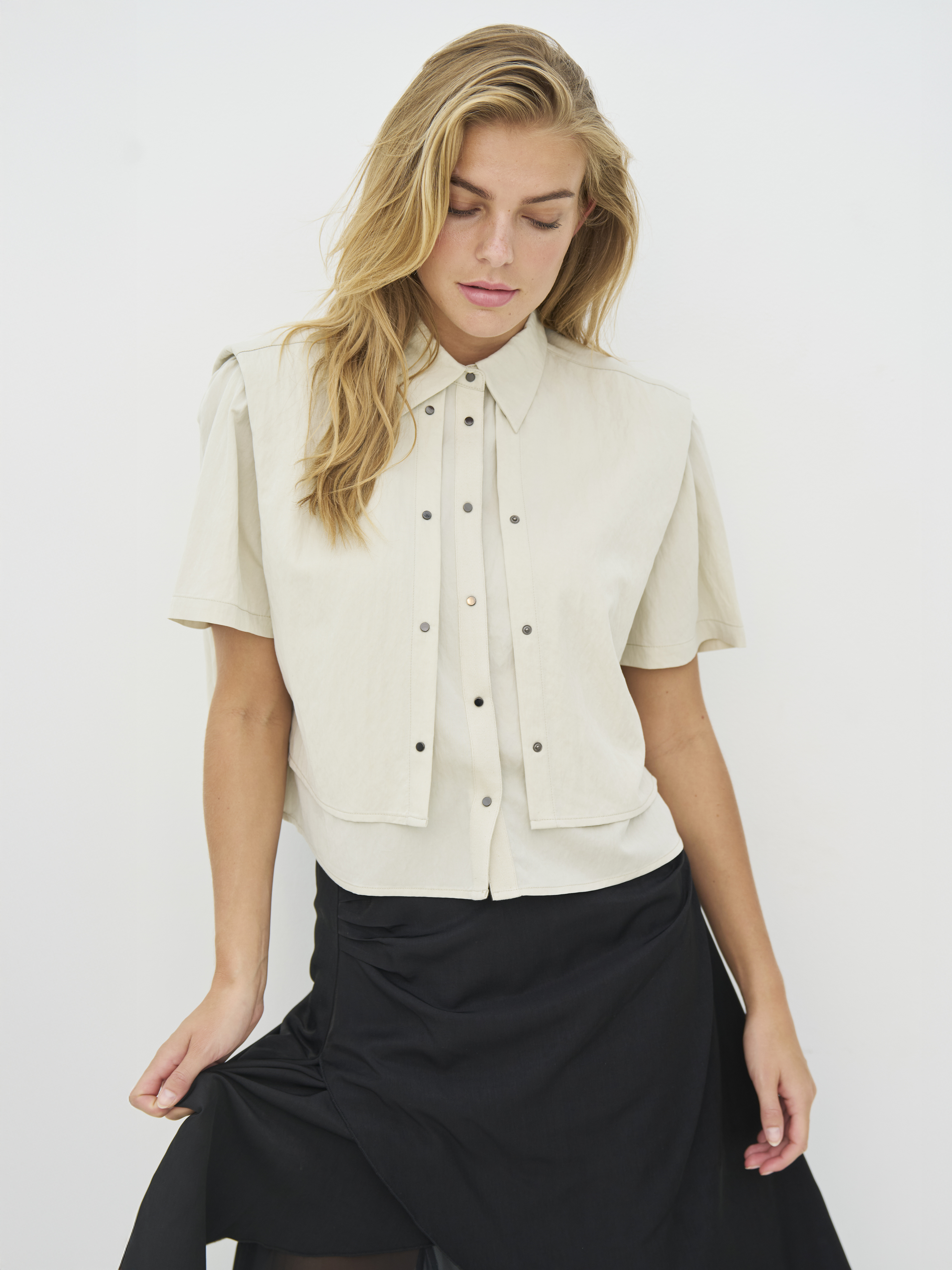 BLOUSE CANSU BOLERO 8732-35 VAN NU DENMARK, deze blouse heeft een korte en moderne snit met korte mouwen en een klassieke kraag. De decoratieve drukknopen aan de voorkant geven een ruwe en doordachte uitstraling, terwijl de gelaagde voorkant de blouse wat extra pit geeft. De pasvorm is recht en licht boxy, waardoor het makkelijk is om zowel dicht als open te dragen. Aan de achterkant is de blouse eenvoudig en valt het mooi langs de rug. Draag het over een top of jurk, of combineer het met hoge taillebroeken voor een relaxte, maar stijlvolle look.