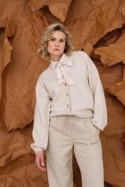 BLOUSE LILO BOW WI25.20.006 SAND VAN MAICAZZ .Deze blouse is net weer even anders dan normale blousejes. De Lilo Bow heeft namelijk een strik bij de kraag wat net weer even die originele look geeft aan het design. een chique glans blouse .Dit item is verkrijgbaar in de kleuren sand, plum en antra.