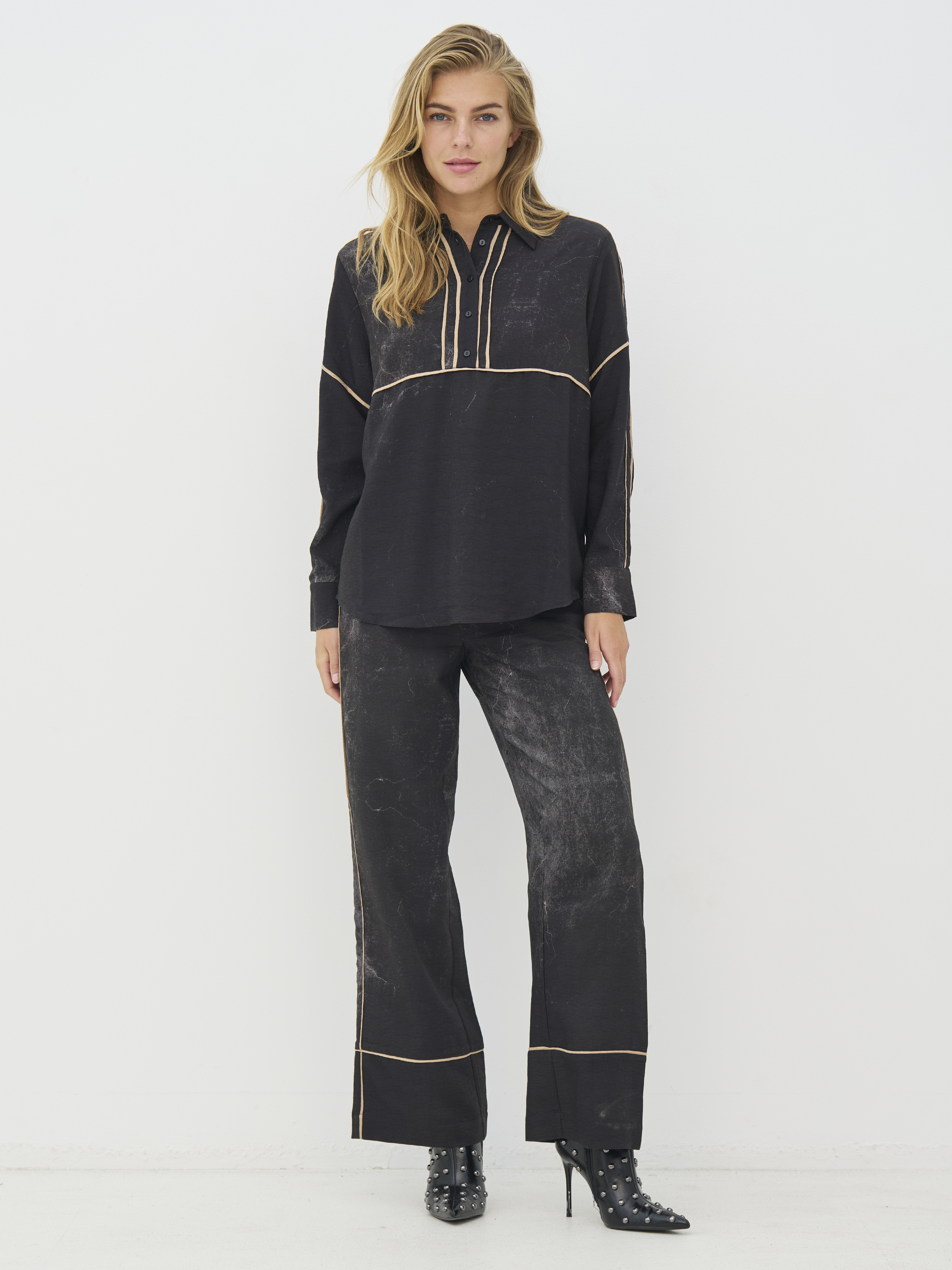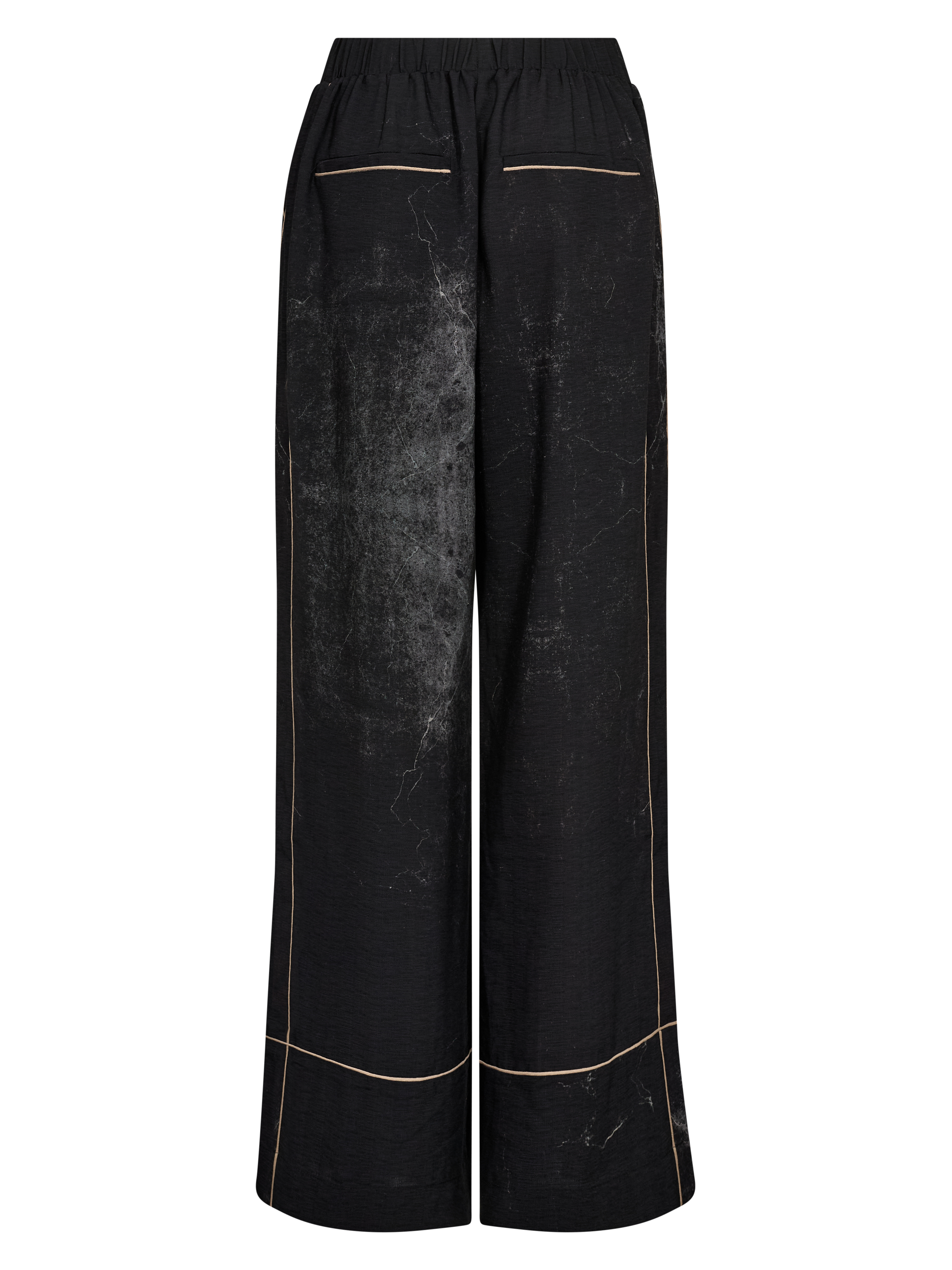 Deze broek hebben een ontspannen pasvorm met wijde pijpen die mooi vallen, wat een onderscheidende maar toch bruikbare uitstraling geeft. De taille heeft elastiek, waardoor ze comfortabel zijn om te dragen, terwijl de grafische wash de broek een rauwe en levendige uitstraling geeft. De fijne contrasterende stiksels langs de benen en bij de zoom geven extra karakter, terwijl de achterkant eenvoudiger is gehouden met discrete zakken. De broeken zijn gemakkelijk te stylen en passen zowel voor alledaagse als meer ontspannen gelegenheden.