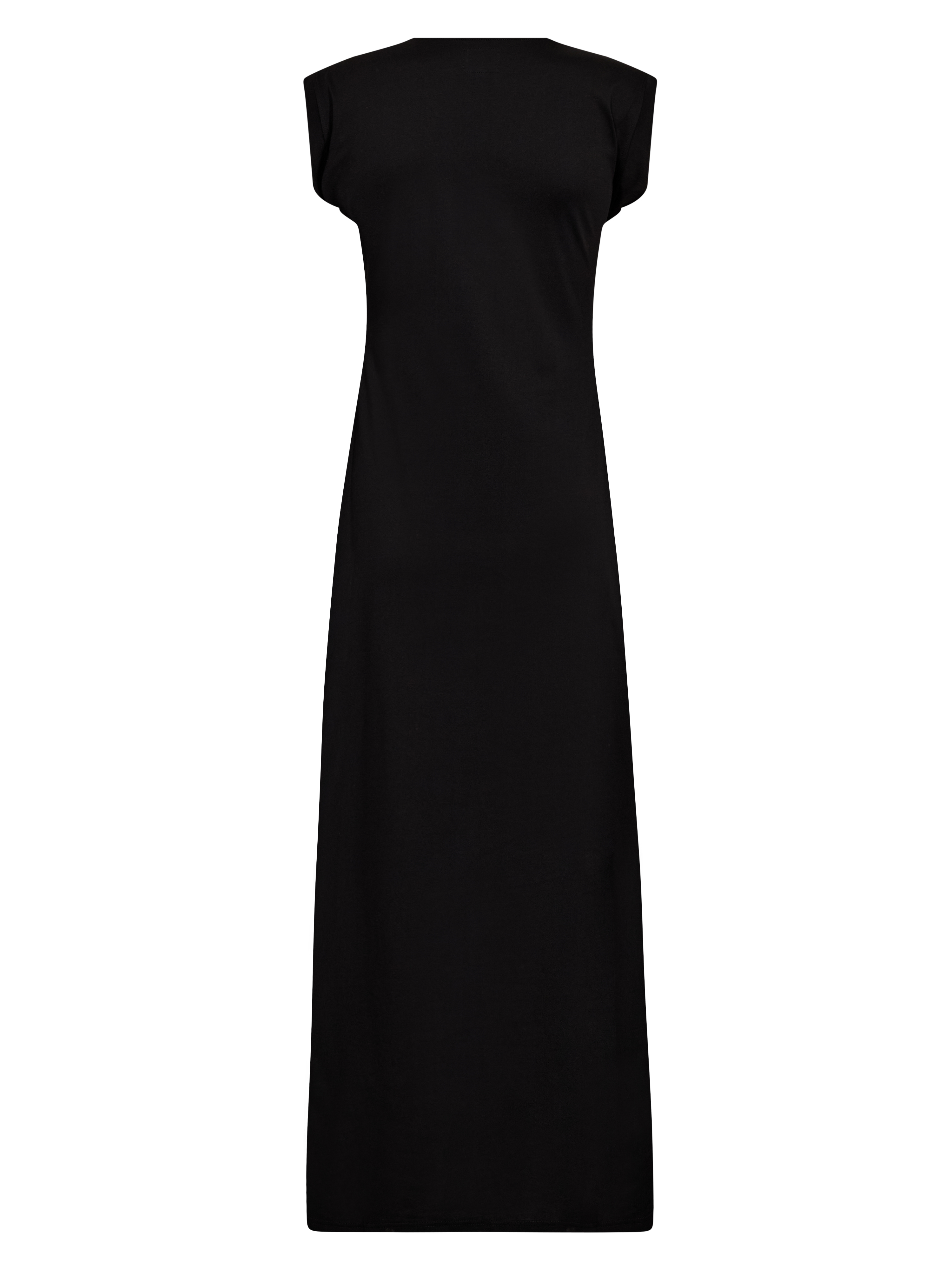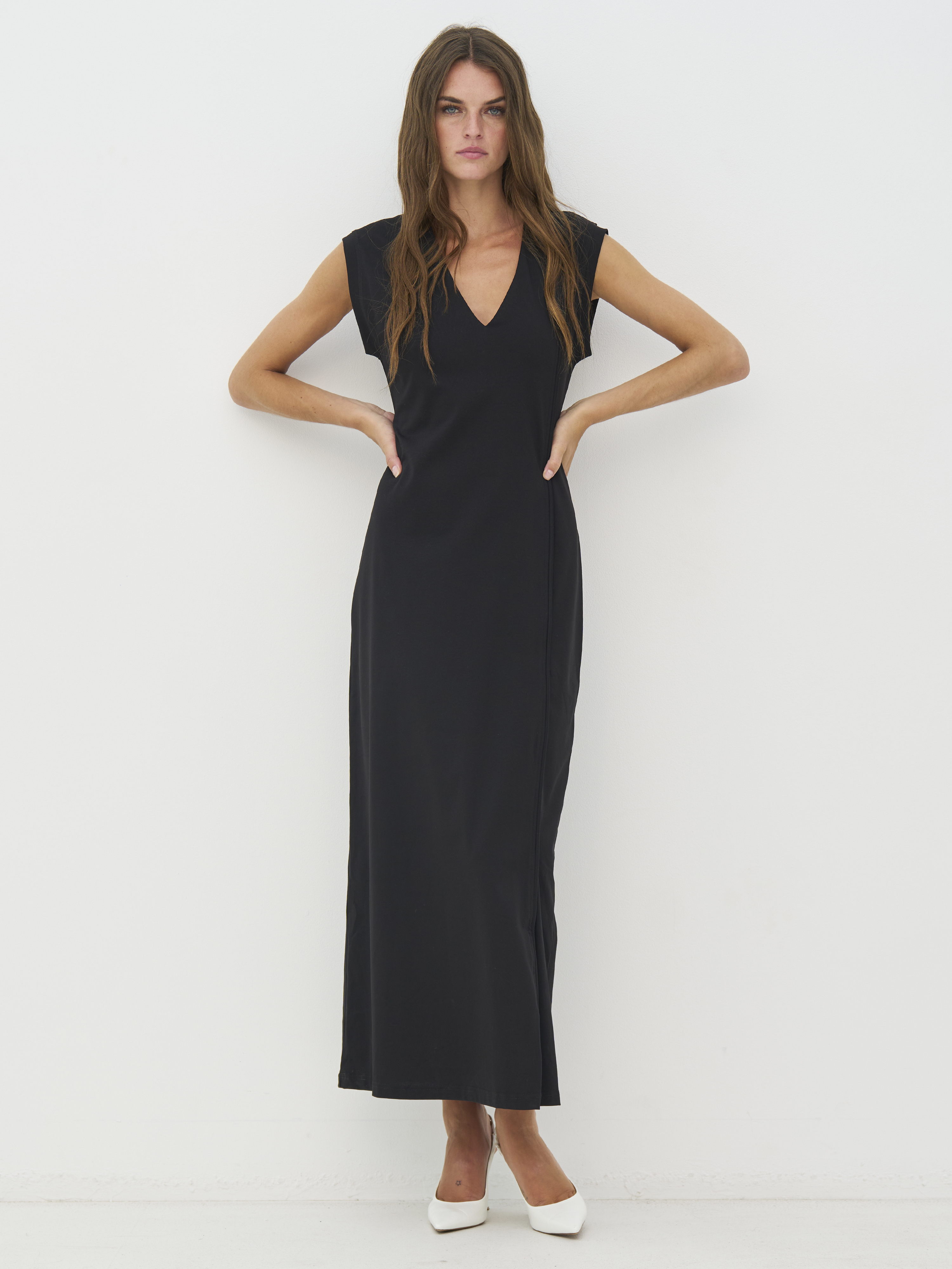 Deze jurk heeft een eenvoudige en tijdloze uitstraling met een lange, rechte silhouet die mooi langs het lichaam valt. De V-hals geeft een lichte en elegante uitstraling, terwijl de korte mouwen een subtiele balans creëren tussen casual en klassiek. Een kleine split aan de zijkant zorgt voor extra bewegingsvrijheid en maakt de jurk comfortabel om te dragen. Het ontwerp is zowel aan de voorkant als aan de achterkant helemaal schoon gehouden, waardoor de jurk gemakkelijk te stylen is voor vele gelegenheden. Draag het met platte schoenen voor alledaags gebruik of met hakken en accessoires wanneer de look wat eleganter mag zijn.
