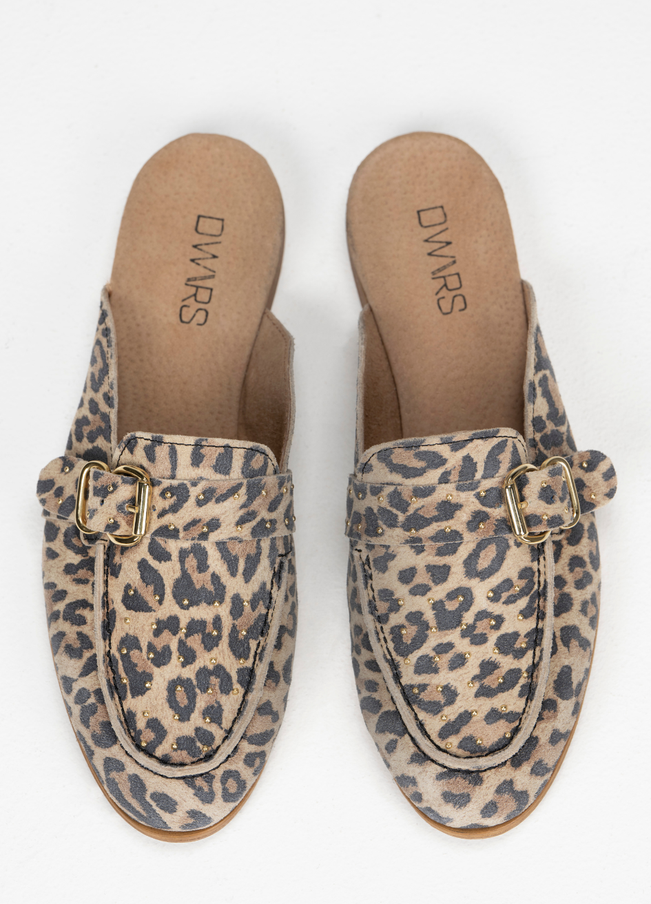 Jasper loafer leopard met gouden studs De Jasper loafer is een echte klassieker en een must-have voor in je garderobe. De Jasper loafer kan dan ook niet ontbreken en is een toffe toevoeging aan elke outfit. Deze gouden studs geven een leuke toevoeging aan de schoen. Aan de buitenzijde is de schoen gemaakt van leer en aan de binnenzijde ook van leer.