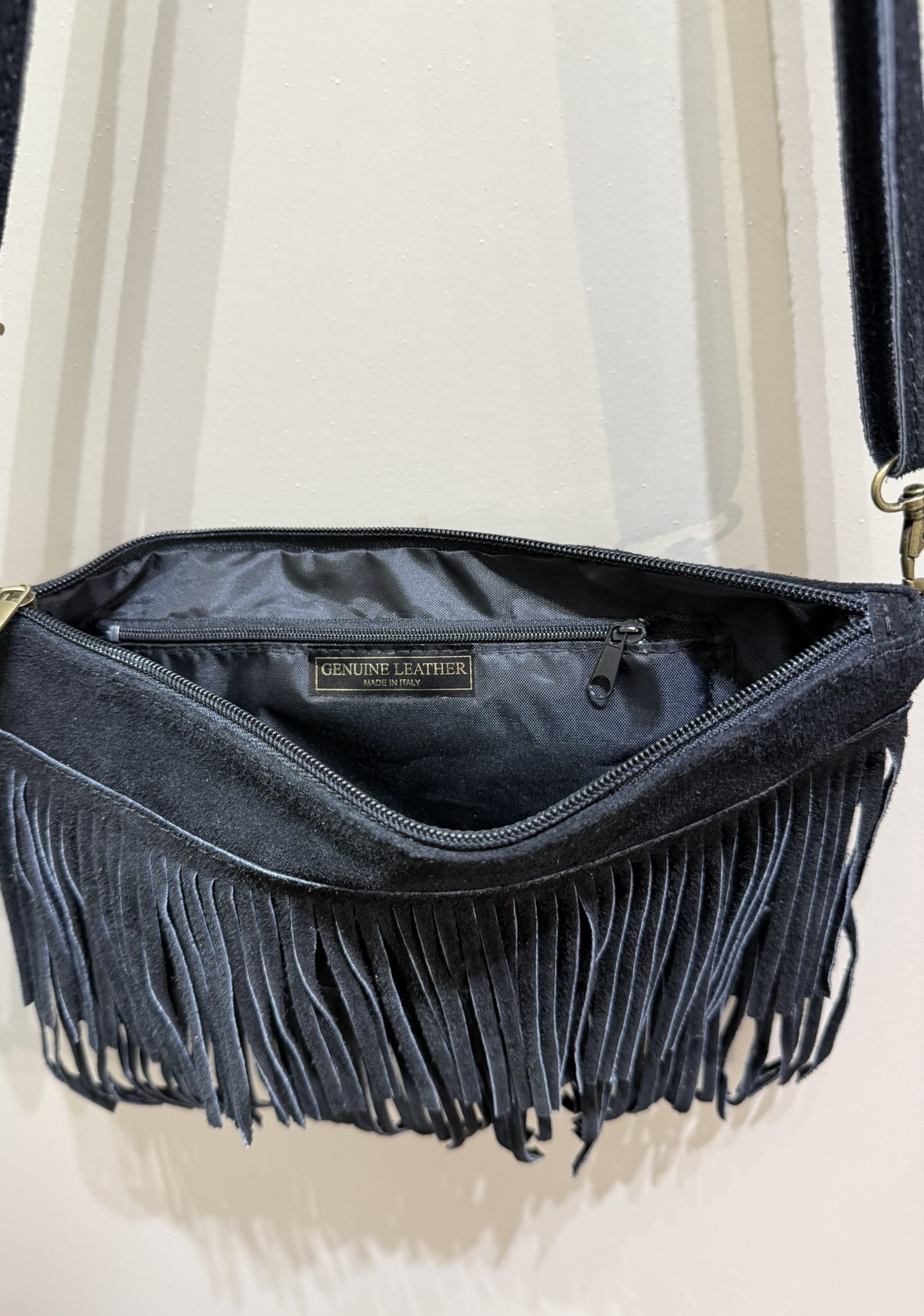 TAS BOHO ZWART ,deze prachtige middelmatige schouder tas is tijdloos en chic.De tas heeft een dubbele laag met franjes die speels mee beweegt met elke stap.In de tas zit er nog een binnen vakje met rits.