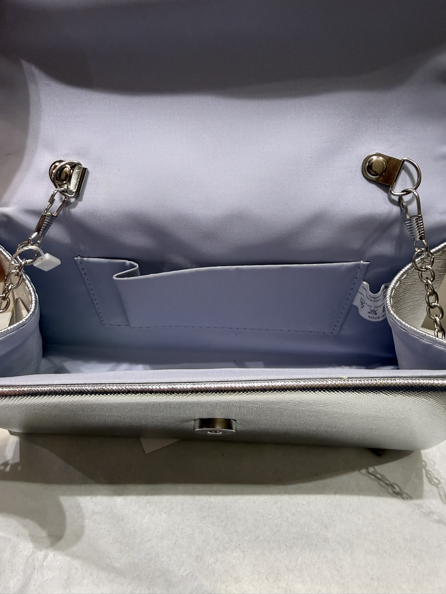 TAS CRYSTAL ZILVER, is een elegante en tijdloze tas die je kan meenemen naar elke gelegenheid. De tas heeft subtiele glitters en een strak ontwerp. de tas komt met een zilveren ketting. kleur: zilver maat: 14cm bij 21,5cm
